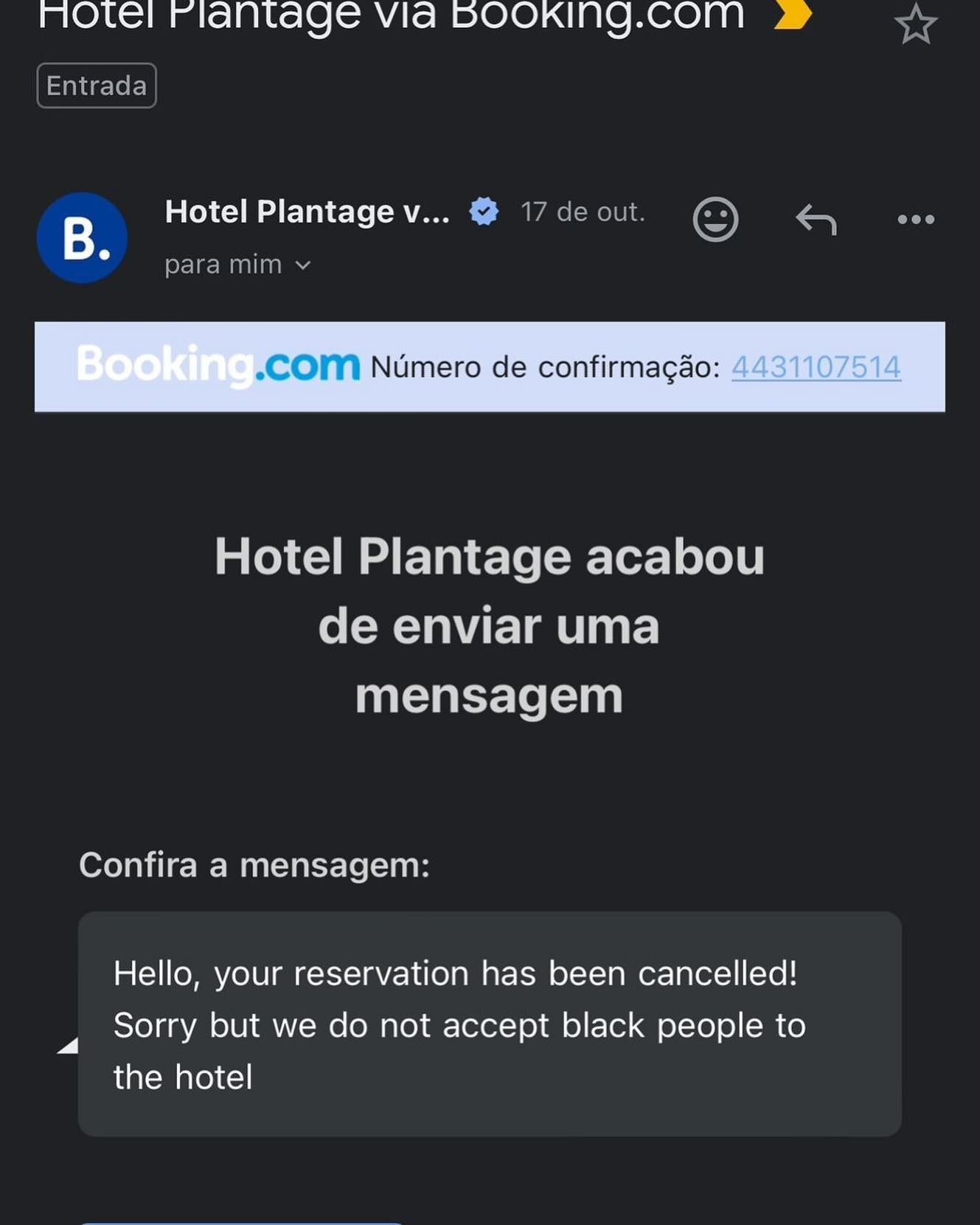 Cliente publicou trecho do e-mail que recebeu após fazer reserva em hotel na Holanda. Estabelecimento negou ter enviado a mensagem e disse tratar e-mail falso na plataforma de hospedagens Booking.com. Mensagem em nome de hotel parceiro do Booking.com diz que o estabelecimento não aceita pessoas negras